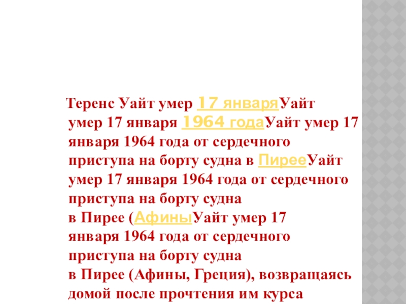 Слайд 9 Теренс Уайт умер 17 январяУайт умер 17 января 1964 годаУайт умер 17 января 1964