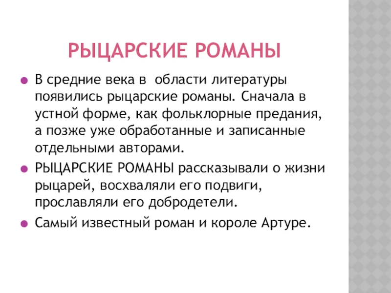 РЫЦАРСКИЕ РОМАНЫ рассказывали о жизни рыцарей, восхваляли его подвиги, прославляли его добродетели.