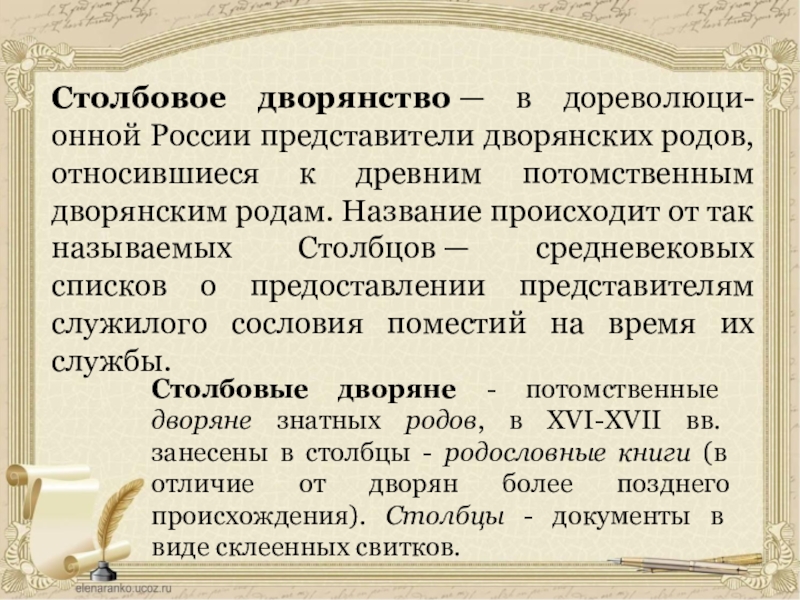 Столбовые дворяне - потомственные дворяне знатных родов, в XVI-XVII вв. занесены в столбцы - родословные книги (в отличие от дворян более позднего происхождения). Столбцы - документы в виде склеенных свитков.