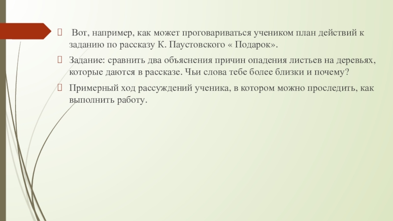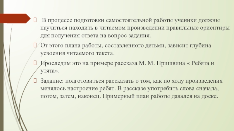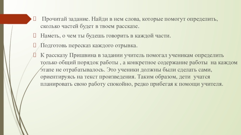 К рассказу Пришвина в задании учитель помогал ученикам определить только общий порядок работы , а конкретное содержание работы на каждом этапе не отрабатывалось. Это ученики должны были сделать сами, ориентируясь на текст произведения. Таким образом, дети учатся планировать свою работу спокойно, редко прибегая к помощи учителя.