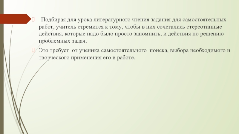 Слайд 11 Подбирая для урока литературного чтения задания для самостоятельных работ, учитель
