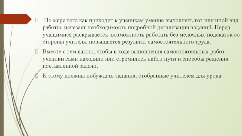 или иной вид работы, исчезает необходимость подробной детализации заданий. Перед учащимися раскрывается возможность работать без мелочных подсказок со стороны учителя, повышается результат самостоятельного труда.