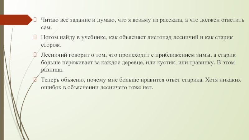 Задание: сравнить два объяснения причин опадения листьев на деревьях, которые даются в рассказе. Чьи слова тебе более близки и почему?