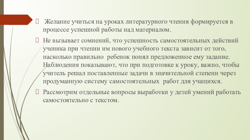 Слайд 4 Желание учиться на уроках литературного чтения формируется в процессе успешной