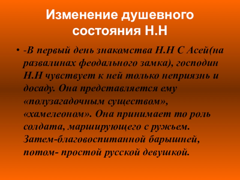 феодального замка), господин Н.Н чувствует к ней только неприязнь и досаду. Она представляется ему «полузагадочным существом», «хамелеоном». Она принимает то роль солдата, марширующего с ружьем. Затем-благовоспитанной барышней, потом- простой русской девушкой.
