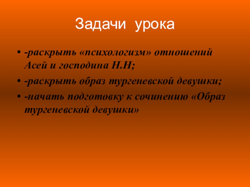-раскрыть «психологизм» отношений Асей и господина Н.Н;
