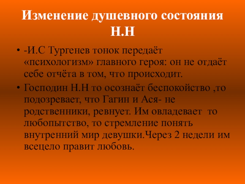 Господин Н.Н то осознаёт беспокойство ,то подозревает, что Гагин и Ася- не родственники, ревнует. Им овладевает то любопытство, то стремление понять внутренний мир девушки.Через 2 недели им всецело правит любовь.