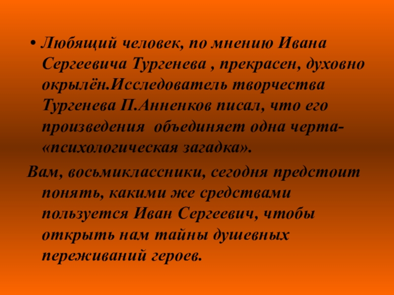 Слайд 4Любящий человек, по мнению Ивана Сергеевича Тургенева , прекрасен, духовно окрылён.Исследователь