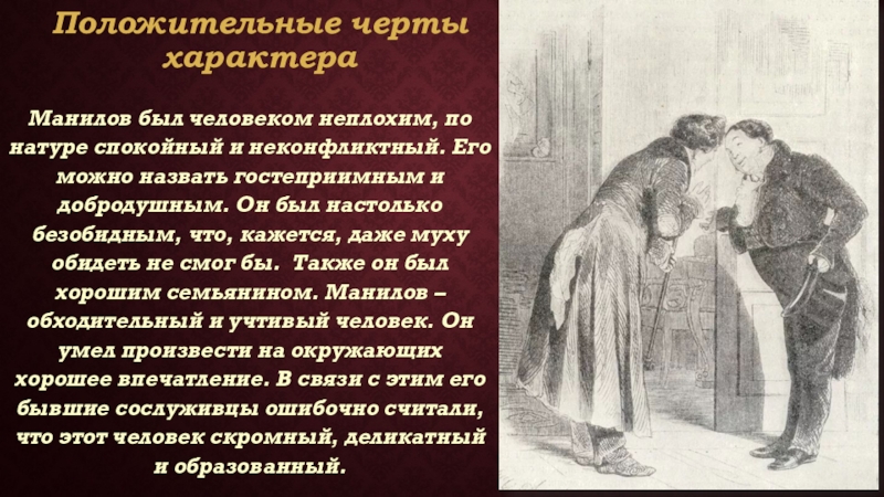 Его можно назвать гостеприимным и добродушным. Он был настолько безобидным, что, кажется, даже муху обидеть не смог бы. Также он был хорошим семьянином. Манилов – обходительный и учтивый человек. Он умел произвести на окружающих хорошее впечатление. В связи с этим его бывшие сослуживцы ошибочно считали, что этот человек скромный, деликатный и образованный.
