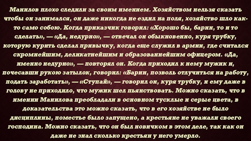 занимался, он даже никогда не ездил на поля, хозяйство шло как-то само собою. Когда приказчик говорил: «Хорошо бы, барин, то и то сделать», — «Да, недурно», — отвечал он обыкновенно, куря трубку, которую курить сделал привычку, когда еще служил в армии, где считался скромнейшим, деликатнейшим и образованнейшим офицером. «Да, именно недурно», — повторял он. Когда приходил к нему мужик и, почесавши рукою затылок, говорил: «Барин, позволь отлучиться на работу, подать заработать», — «Ступай», — говорил он, куря трубку, и ему даже в голову не приходило, что мужик шел пьянствовать. Можно сказать, что в имении Манилова преобладали в основном тусклые и серые цвета, в доказательства это можно сказать, что в его хозяйстве не было дисциплины, поместье было запущено, а крестьяне не уважали своего господина. Можно сказать, что он был новичком в этом деле, так как он даже не знал сколько крестьян у него умерло.