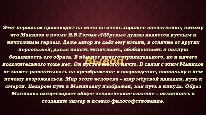 Манилов в поэме Н.В.Гоголя «Мёртвые души» является пустым и ничтожным героем. Даже автор не даёт ему имени, в отличие от других персонажей, давая понять типичность, обобщённость и полную безличность его образа. В нём нет ничего отрицательного, но и ничего положительного тоже нет. Он пустое место, ничто. В связи с этим Манилов не может рассчитывать на преображение и возрождение, поскольку в нём нечему возрождаться. Мир этого человека – мир мёртвой идиллии, путь к смерти. Недаром путь в Маниловку изображён, как путь в никуда. Образ Манилова олицетворяет общее человеческое явление – склонность к созданию химер и псевдо философствование.