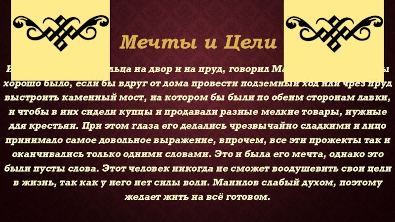 говорил Манилов о том, как бы хорошо было, если бы вдруг от дома провести подземный ход или чрез пруд выстроить каменный мост, на котором бы были по обеим сторонам лавки, и чтобы в них сидели купцы и продавали разные мелкие товары, нужные для крестьян. При этом глаза его делались чрезвычайно сладкими и лицо принимало самое довольное выражение, впрочем, все эти прожекты так и оканчивались только одними словами. Это и была его мечта, однако это были пусты слова. Этот человек никогда не сможет воодушевить свои цели в жизнь, так как у него нет силы воли. Манилов слабый духом, поэтому желает жить на всё готовом.