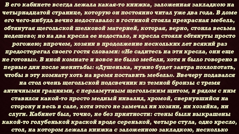 Слайд 8В его кабинете всегда лежала какая-то книжка, заложенная закладкою на четырнадцатой