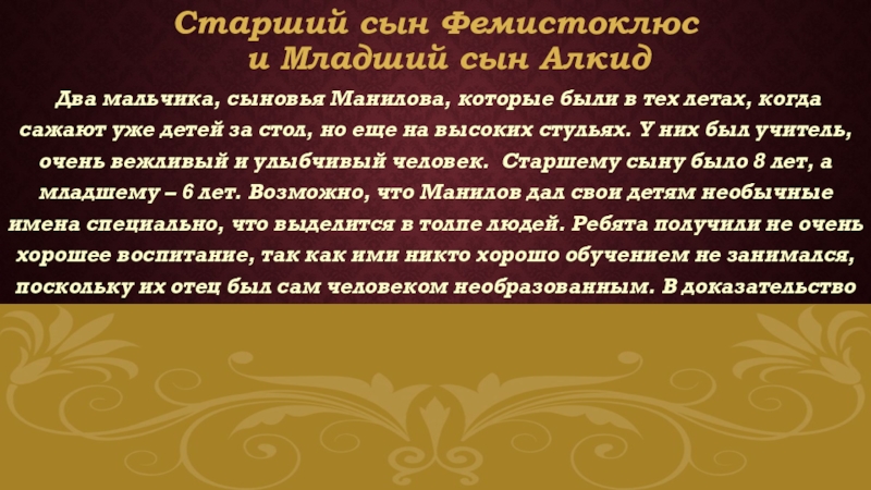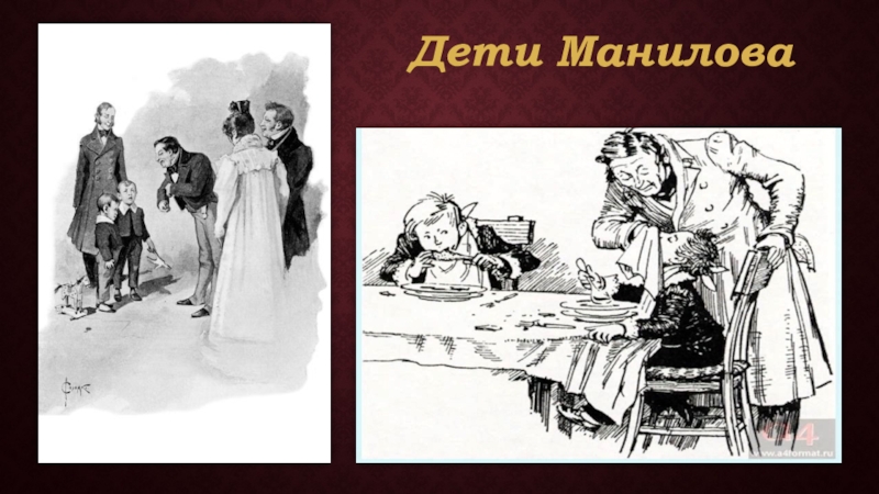 в тех летах, когда сажают уже детей за стол, но еще на высоких стульях. У них был учитель, очень вежливый и улыбчивый человек. Старшему сыну было 8 лет, а младшему – 6 лет. Возможно, что Манилов дал свои детям необычные имена специально, что выделится в толпе людей. Ребята получили не очень хорошее воспитание, так как ими никто хорошо обучением не занимался, поскольку их отец был сам человеком необразованным. В доказательство этому можно сказать, что они даже за столом не умели себя правильно вести.