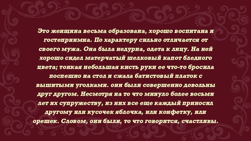 Слайд 19Это женщина весьма образована, хорошо воспитана и гостеприимна. По характеру сильно