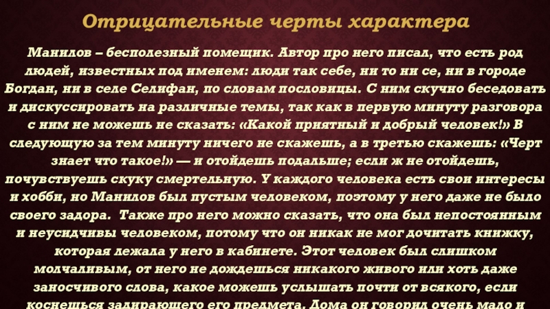 есть род людей, известных под именем: люди так себе, ни то ни се, ни в городе Богдан, ни в селе Селифан, по словам пословицы. С ним скучно беседовать и дискуссировать на различные темы, так как в первую минуту разговора с ним не можешь не сказать: «Какой приятный и добрый человек!» В следующую за тем минуту ничего не скажешь, а в третью скажешь: «Черт знает что такое!» — и отойдешь подальше; если ж не отойдешь, почувствуешь скуку смертельную. У каждого человека есть свои интересы и хобби, но Манилов был пустым человеком, поэтому у него даже не было своего задора. Также про него можно сказать, что она был непостоянным и неусидчивы человеком, потому что он никак не мог дочитать книжку, которая лежала у него в кабинете. Этот человек был слишком молчаливым, от него не дождешься никакого живого или хоть даже заносчивого слова, какое можешь услышать почти от всякого, если коснешься задирающего его предмета. Дома он говорил очень мало и большею частию размышлял и думал, но о чем он думал, тоже разве Богу было известно.