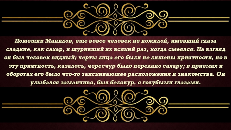 Слайд 12Помещик Манилов, еще вовсе человек не пожилой, имевший глаза сладкие, как