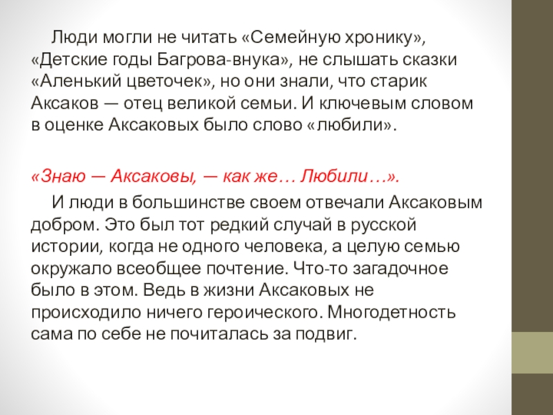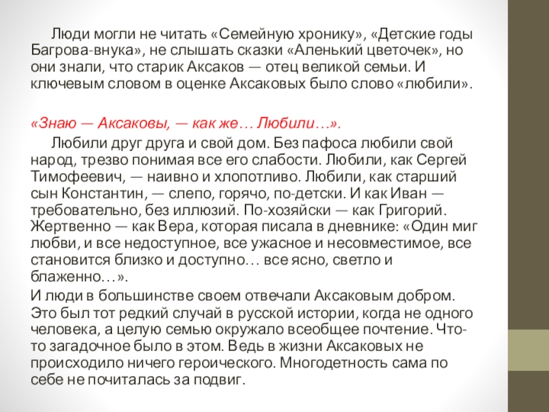 сказки «Аленький цветочек», но они знали, что старик Аксаков — отец великой семьи. И ключевым словом в оценке Аксаковых было слово «любили».