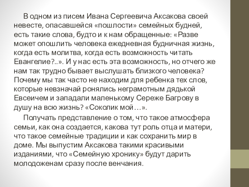 семейных будней, есть такие слова, будто и к нам обращенные: «Разве может опошлить человека ежедневная будничная жизнь, когда есть молитва, когда есть возможность читать Евангелие?..». И у нас есть эта возможность, но отчего же нам так трудно бывает выслушать близкого человека? Почему мы так часто не находим для ребенка тех слов, которые невзначай ронялись неграмотным дядькой Евсеичем и западали маленькому Сереже Багрову в душу на всю жизнь? «Соколик мой…».