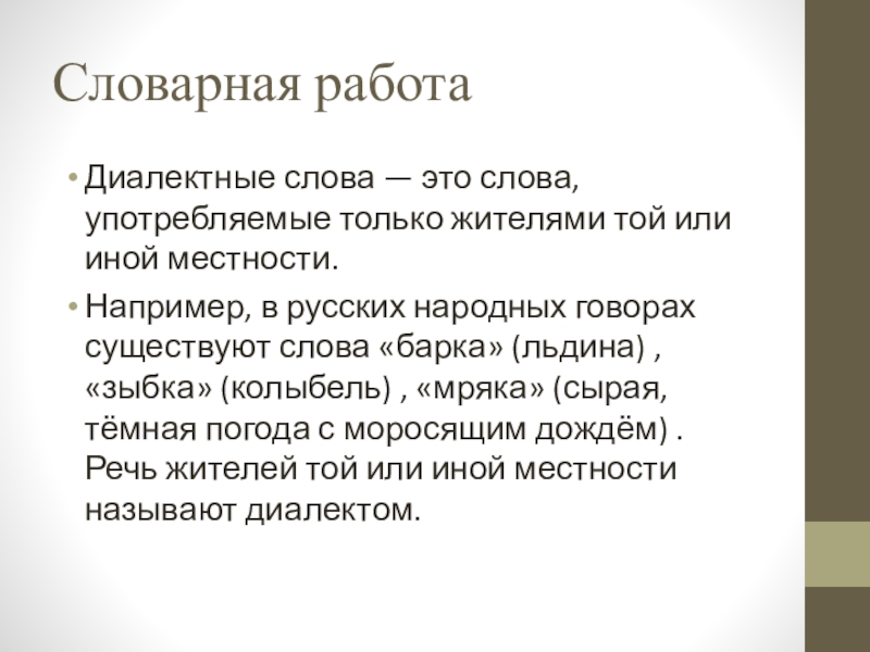 Например, в русских народных говорах существуют слова «барка» (льдина) , «зыбка» (колыбель) , «мряка» (сырая, тёмная погода с моросящим дождём) . Речь жителей той или иной местности называют диалектом.