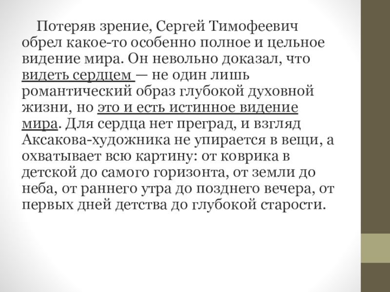 Слайд 24 Потеряв зрение, Сергей Тимофеевич обрел какое-то особенно полное и цельное видение