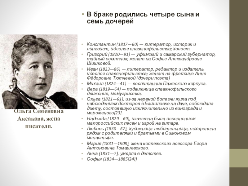 Слайд 21Ольга Семеновна Аксакова, жена писателя.