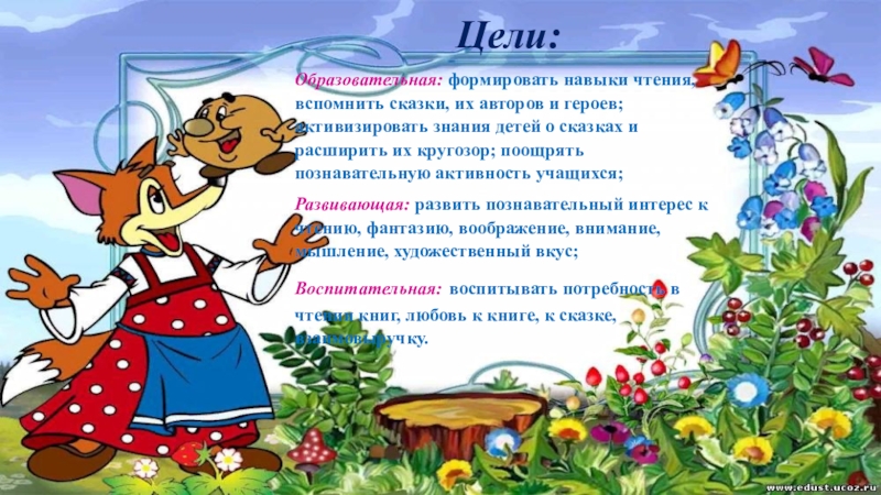 Цели: Образовательная: формировать навыки чтения, вспомнить сказки, их авторов и героев; активизировать знания детей о сказках и расширить их кругозор;
