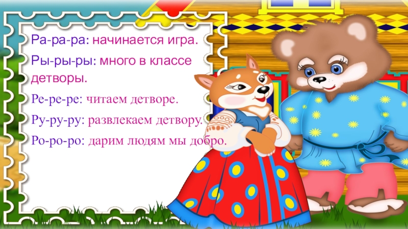 Ра-ра-ра: начинается игра.Ры-ры-ры: много в классе детворы.Ре-ре-ре: читаем детворе.Ру-ру-ру: развлекаем детвору.Ро-ро-ро: дарим людям мы добро.