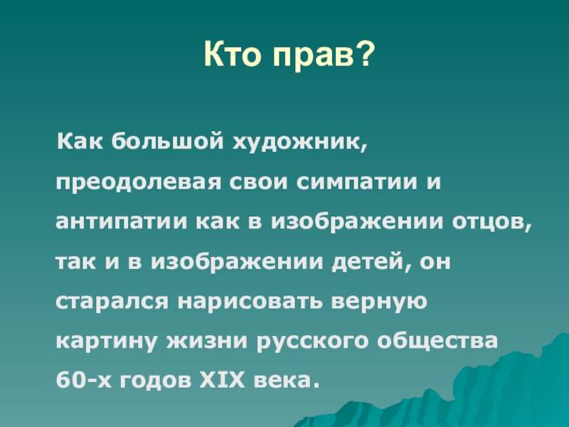 как в изображении отцов, так и в изображении детей, он старался нарисовать верную картину жизни русского общества 60-х годов XIX века.