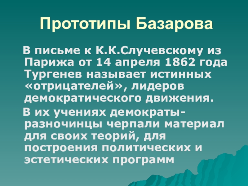 1862 года Тургенев называет истинных «отрицателей», лидеров демократического движения.