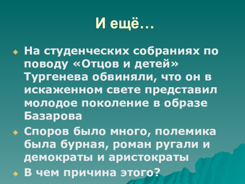 На студенческих собраниях по поводу «Отцов и детей» Тургенева обвиняли,