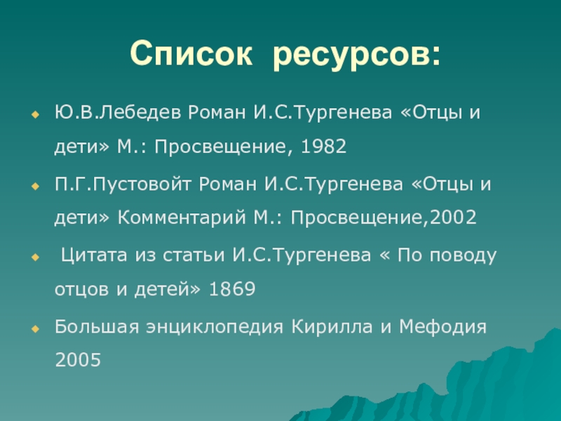 И.С.Тургенева «Отцы и дети» Комментарий М.: Просвещение,2002