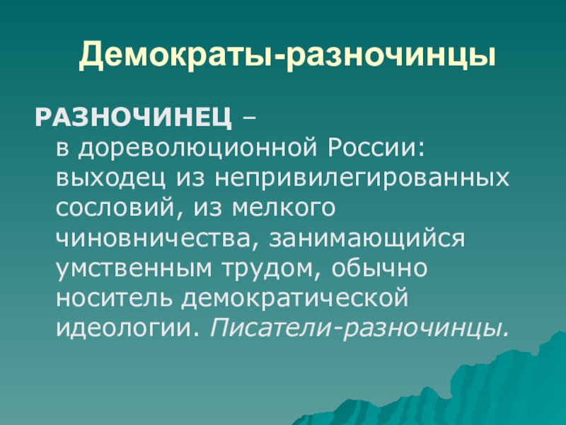 чиновничества, занимающийся умственным трудом, обычно носитель демократической идеологии. Писатели-разночинцы.