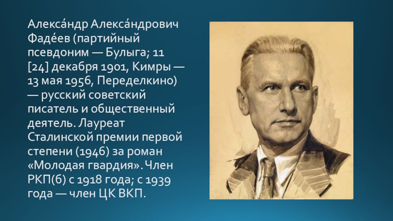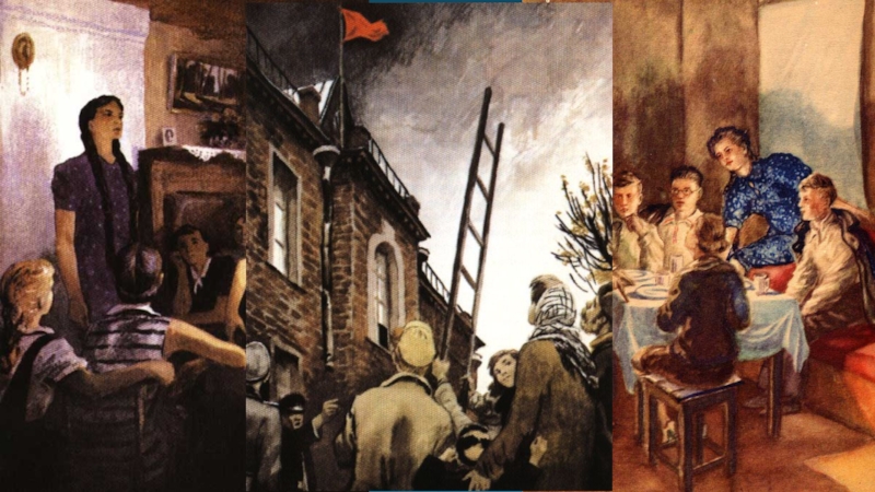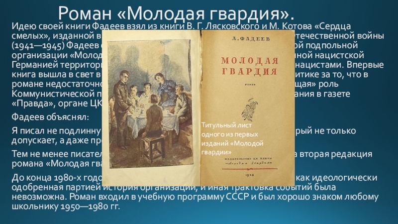 Г. Лясковского и М. Котова «Сердца смелых», изданной в 1944 году. Сразу после окончания Великой Отечественной войны (1941—1945) Фадеев садится за написание романа о Краснодонской подпольной организации «Молодая гвардия», действовавшей на оккупированной нацистской Германией территории, многие члены которой были уничтожены нацистами. Впервые книга вышла в свет в 1946 году. Фадеев был подвергнут резкой критике за то, что в романе недостаточно ярко выражена «руководящая и направляющая» роль Коммунистической партии и получил суровые критические замечания в газете «Правда», органе ЦК ВКП(б), фактически от самого Сталина.