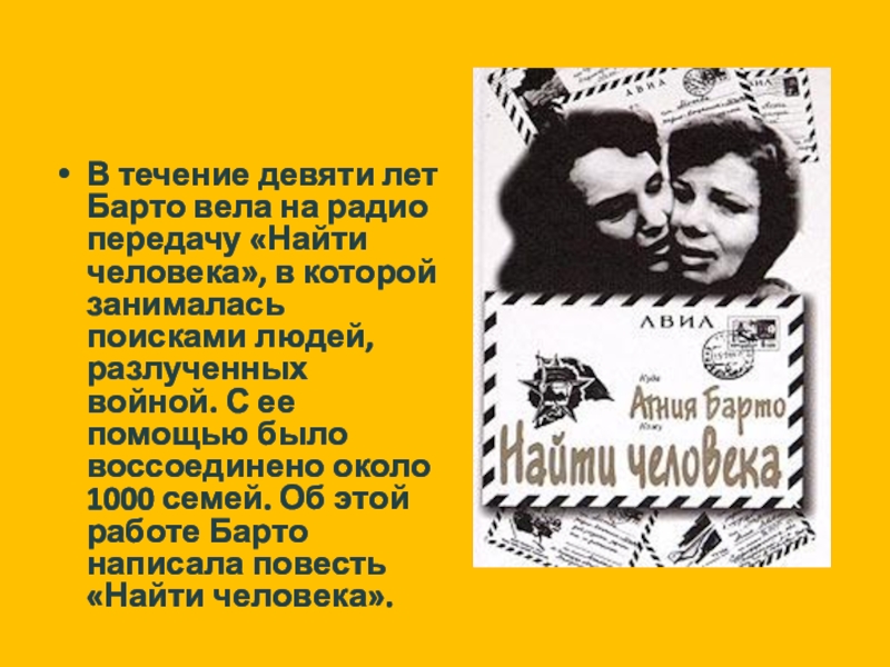 Слайд 6В течение девяти лет Барто вела на радио передачу «Найти человека»,