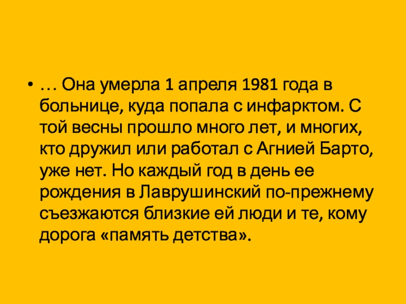 с инфарктом. С той весны прошло много лет, и многих, кто дружил или работал с Агнией Барто, уже нет. Но каждый год в день ее рождения в Лаврушинский по-прежнему съезжаются близкие ей люди и те, кому дорога «память детства».