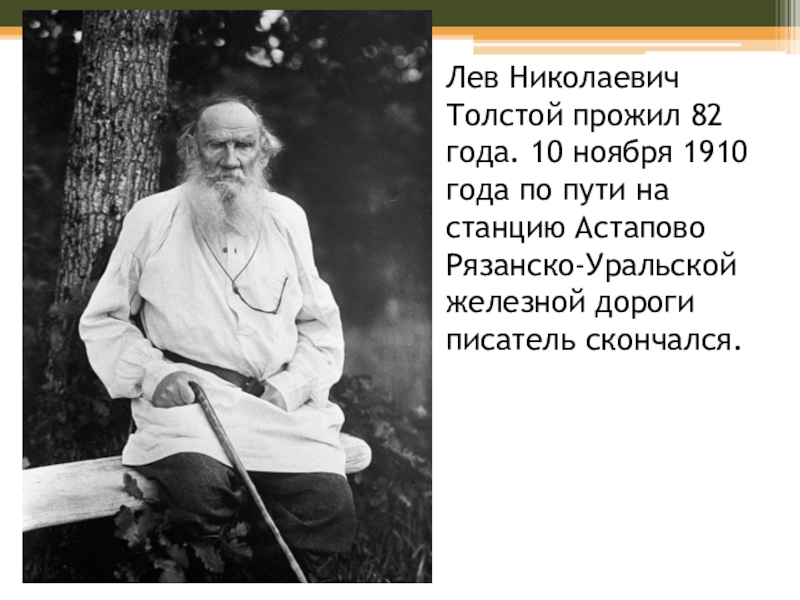 Слайд 6Лев Николаевич Толстой прожил 82 года. 10 ноября 1910 года по
