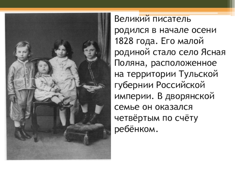 стало село Ясная Поляна, расположенное на территории Тульской губернии Российской империи. В дворянской семье он оказался четвёртым по счёту ребёнком.