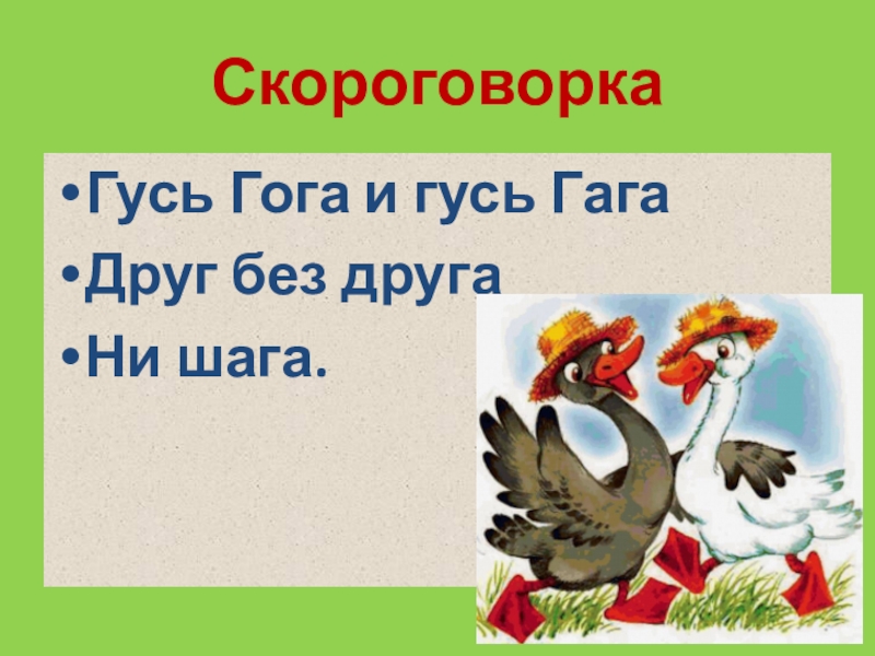 Скороговорка Гусь Гога и гусь Гага Друг без другаНи шага.