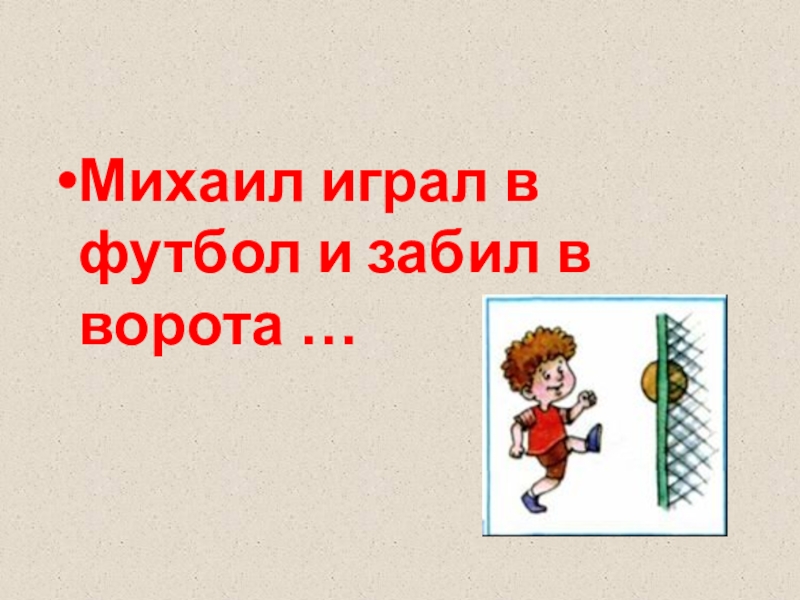 Слайд 2Михаил играл в футбол и забил в ворота …