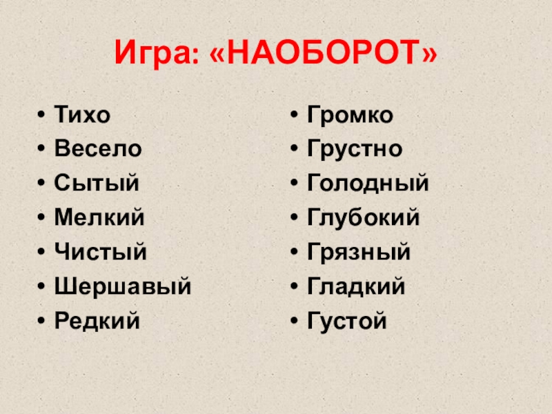 Игра: «НАОБОРОТ»ТихоВеселоСытыйМелкийЧистыйШершавыйРедкийГромкоГрустноГолодныйГлубокийГрязныйГладкийГустой