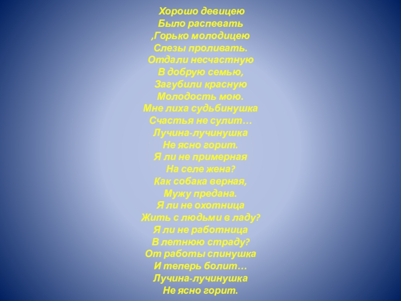 Слайд 17 Хорошо девицею Было распевать ,Горько молодицею Слезы проливать. Отдали несчастную В добрую семью, Загубили красную Молодость мою. Мне лиха