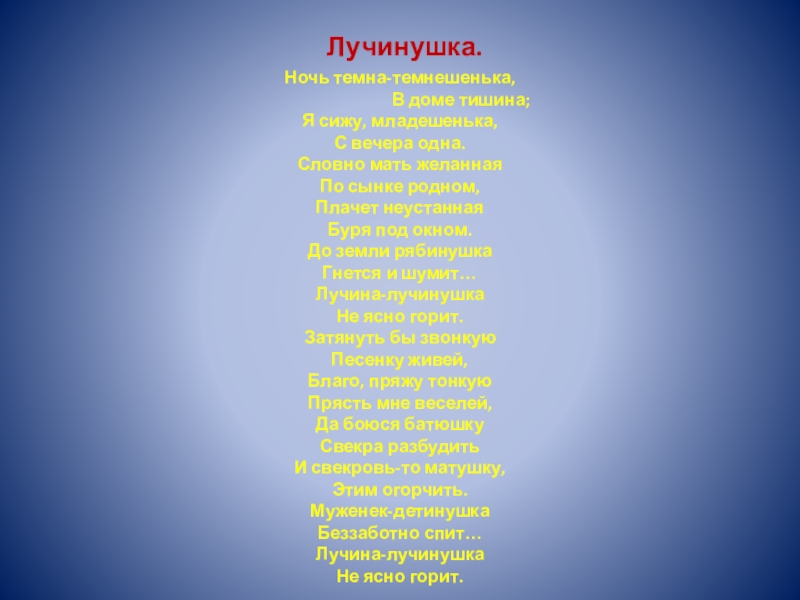 Слайд 16 Лучинушка. Ночь темна-темнешенька,