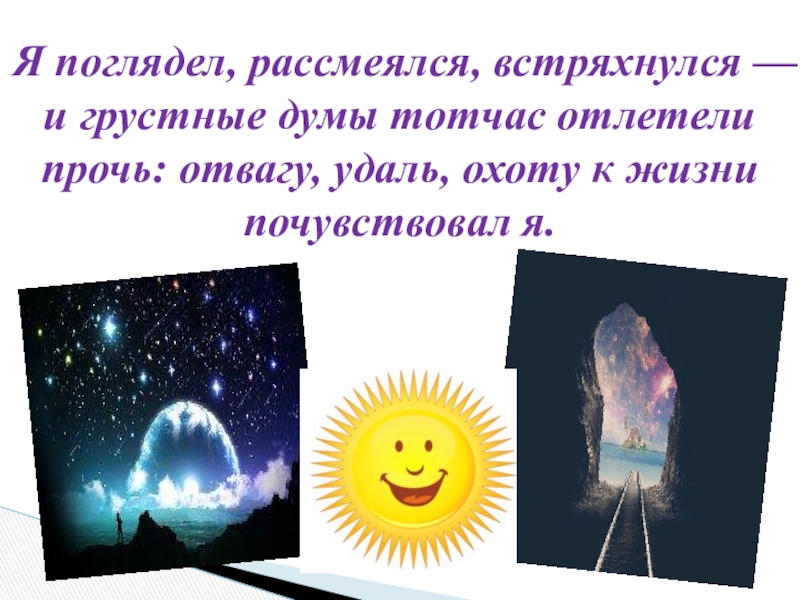 Слайд 12Я поглядел, рассмеялся, встряхнулся — и грустные думы тотчас отлетели прочь: