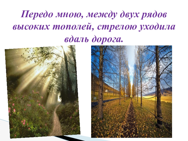 Слайд 8Передо мною, между двух рядов высоких тополей, стрелою уходила вдаль дорога.