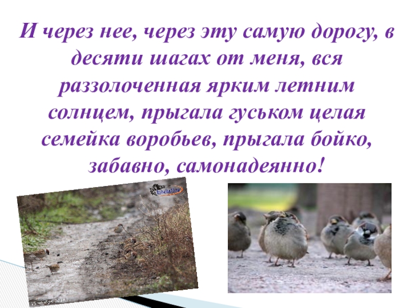 меня, вся раззолоченная ярким летним солнцем, прыгала гуськом целая семейка воробьев, прыгала бойко, забавно, самонадеянно!