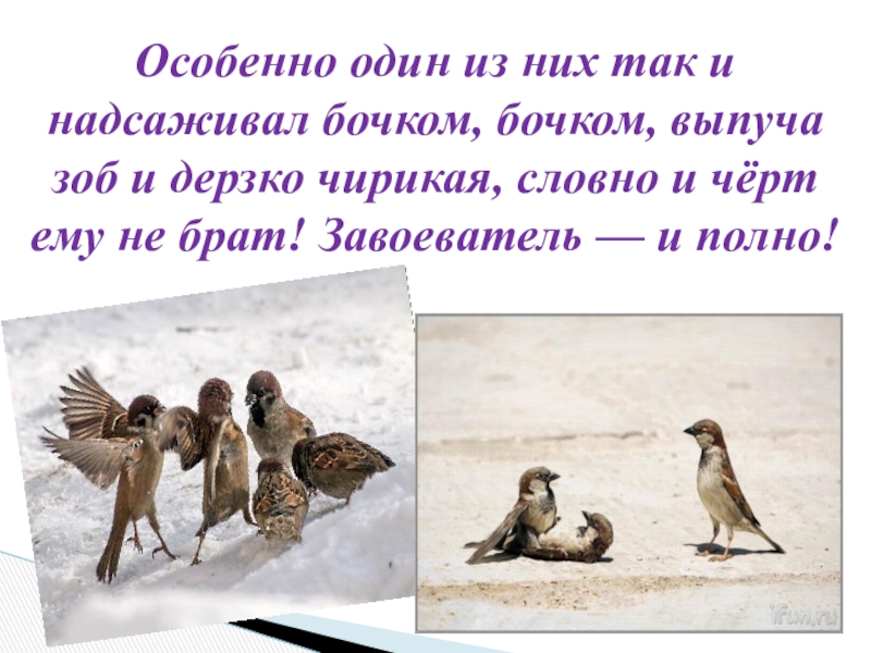 Особенно один из них так и надсаживал бочком, бочком, выпуча зоб и дерзко чирикая, словно и чёрт