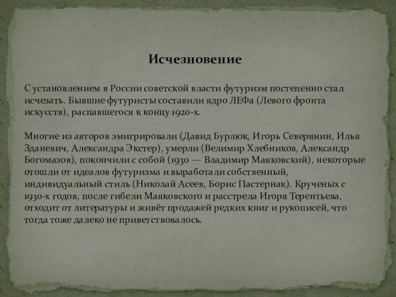 С установлением в России советской власти футуризм постепенно стал исчезать. Бывшие