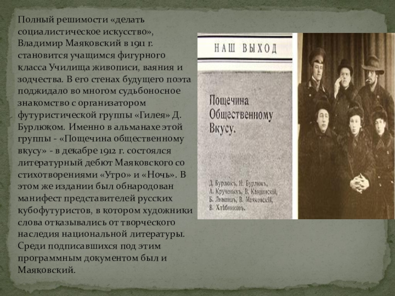 учащимся фигурного класса Училища живописи, ваяния и зодчества. В его стенах будущего поэта поджидало во многом судьбоносное знакомство с организатором футуристической группы «Гилея» Д. Бурлюком. Именно в альманахе этой группы - «Пощечина общественному вкусу» - в декабре 1912 г. состоялся литературный дебют Маяковского со стихотворениями «Утро» и «Ночь». В этом же издании был обнародован манифест представителей русских кубофутуристов, в котором художники слова отказывались от творческого наследия национальной литературы. Среди подписавшихся под этим программным документом был и Маяковский.