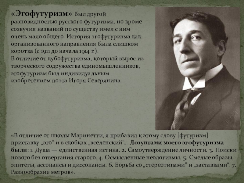 Слайд 5«Эгофутуризм» был другой разновидностью русского футуризма, но кроме созвучия названий по